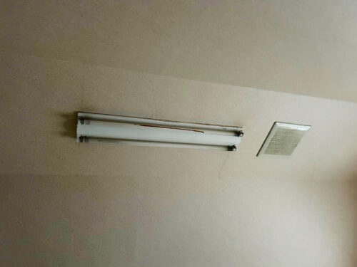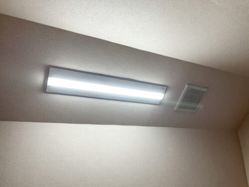 今回の電気工事では、従来の剥き出し型蛍光灯をすべて撤去し、新たにカバー付きのLED照明器具へと交換いたしました。