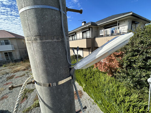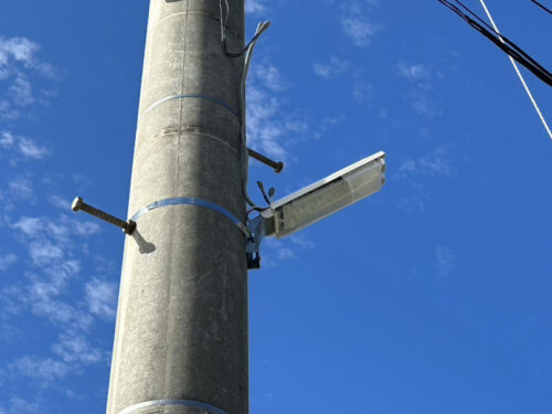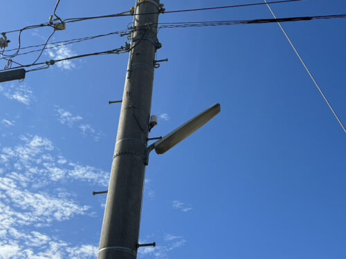 今回の防犯灯の取り替え工事は、電気工事士1名で対応し、5基すべての交換作業を含めた予測作業時間は約3〜4時間程度でした。既存の配線や電柱設備を活用することで、周囲への影響を抑えながら安全に施工を進めています。