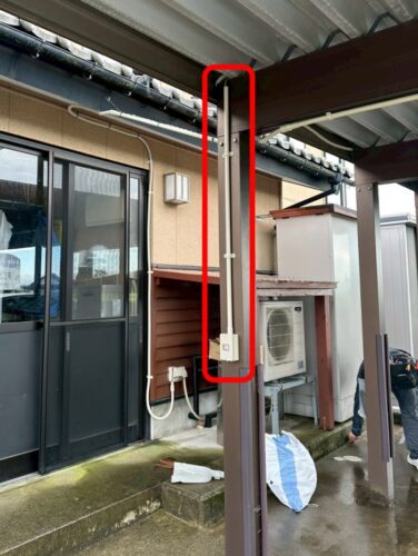 現場に伺ってまず驚いたのが、そのカーポートの立派さです。お車が3台から4台はゆったり入る広い屋根付きのスペース。でも、夜になるとかなり暗いとのこと。確認してみると、ホームセンターで購入された電池式のセンサーライトが柱に1台ポツンと付いているだけでした。これ、実は現場を回っているとよく見かける「あるある」なのですが、この広さに対してその小さなライト1台では、正直に言って防犯にも実用にも全く足りていないのが本音です。