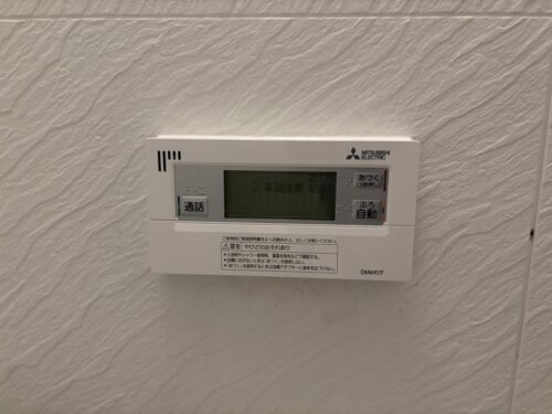 施工後の写真1枚目では、裏口付近に設置されたMITSUBISHI製エコキュート本体が確認できます。省エネ性能が高く、北九州市の一般家庭でも電気使用量を抑えやすい仕様です。写真2枚目では、浴室内のリモコンが新品のMITSUBISHI製に交換され、操作性と視認性が大きく改善されました。